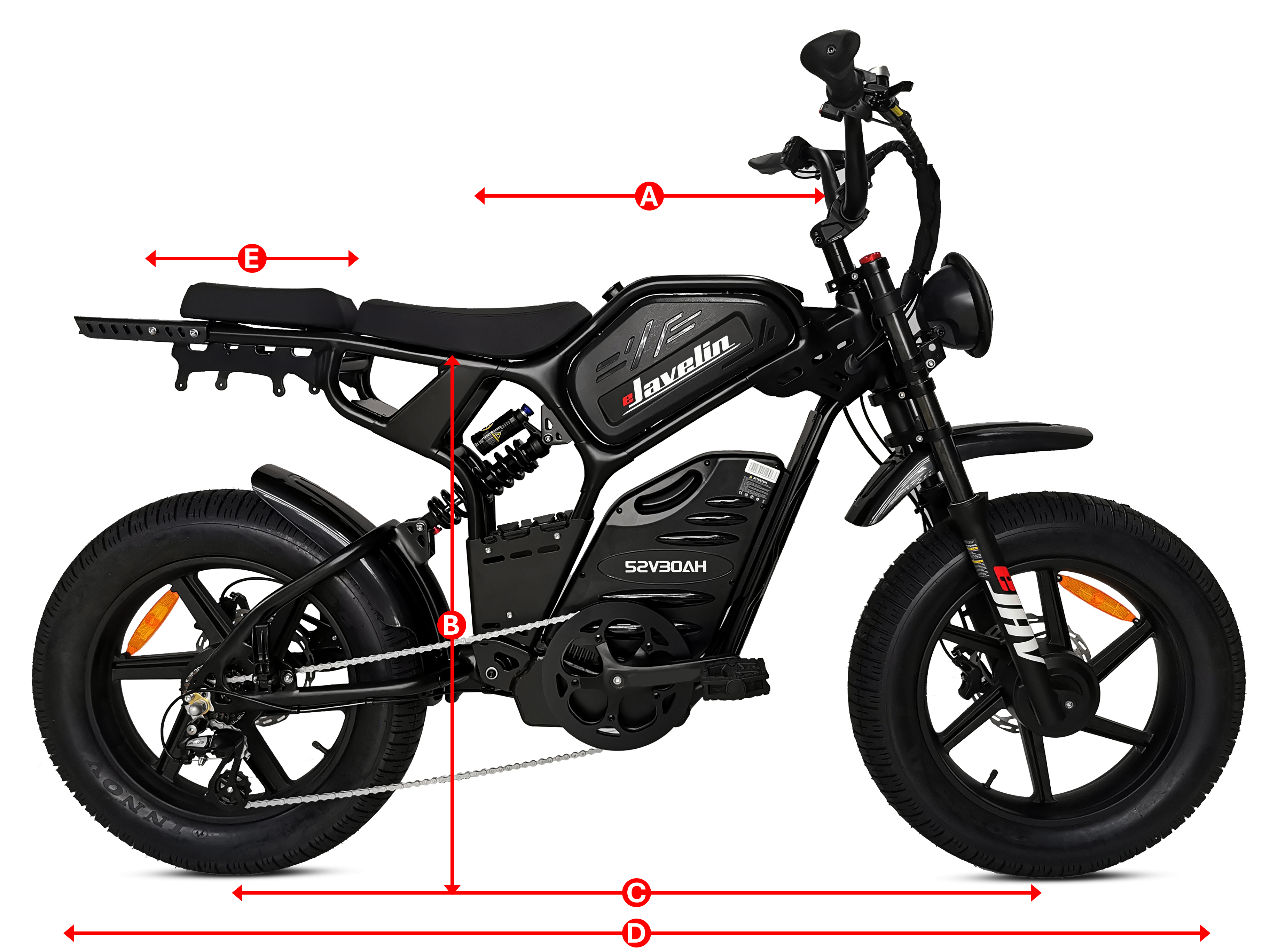 The Comanche offers 20” x 4.5” puncture resistant fat tires, and adjustable tension front shocks with integrated frame suspension. A quality assured powerful 52V 30Ah Samsung 21700 cells, cell battery supports ample volts and amp hours for power and range.